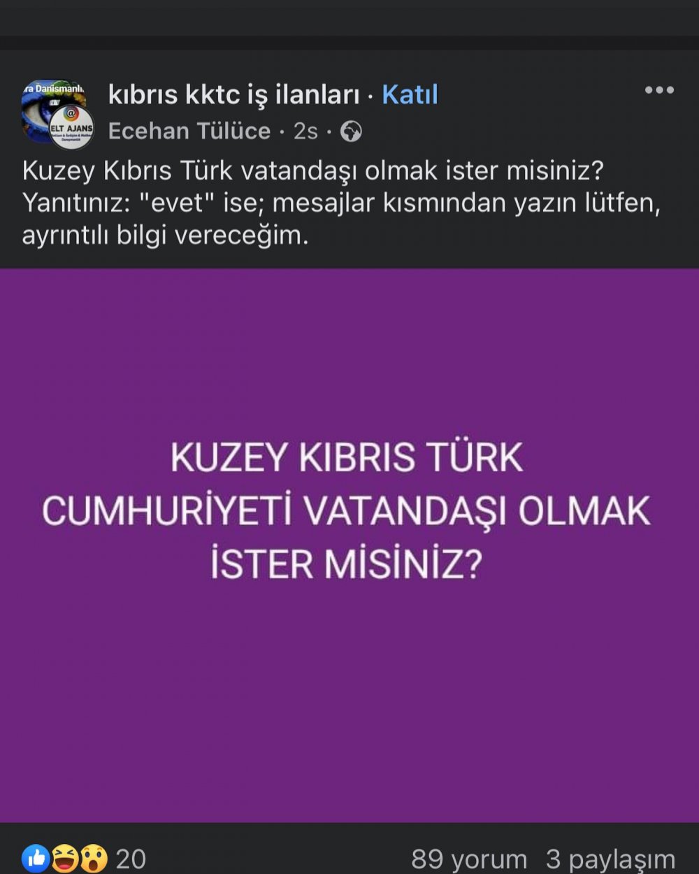 İçişleri Bakanı Dursun Oğuz, dün akşam sosyal medya platformlarında paylaşılan “Kuzey Kıbrıs Türk Cumhuriyeti vatandaşı olmak ister misiniz?” başlıklı ilanın sahibi Ecehan Tülücü gerçek adıyla Lütfiye Tülüce’nin yakalandığını duyurdu.