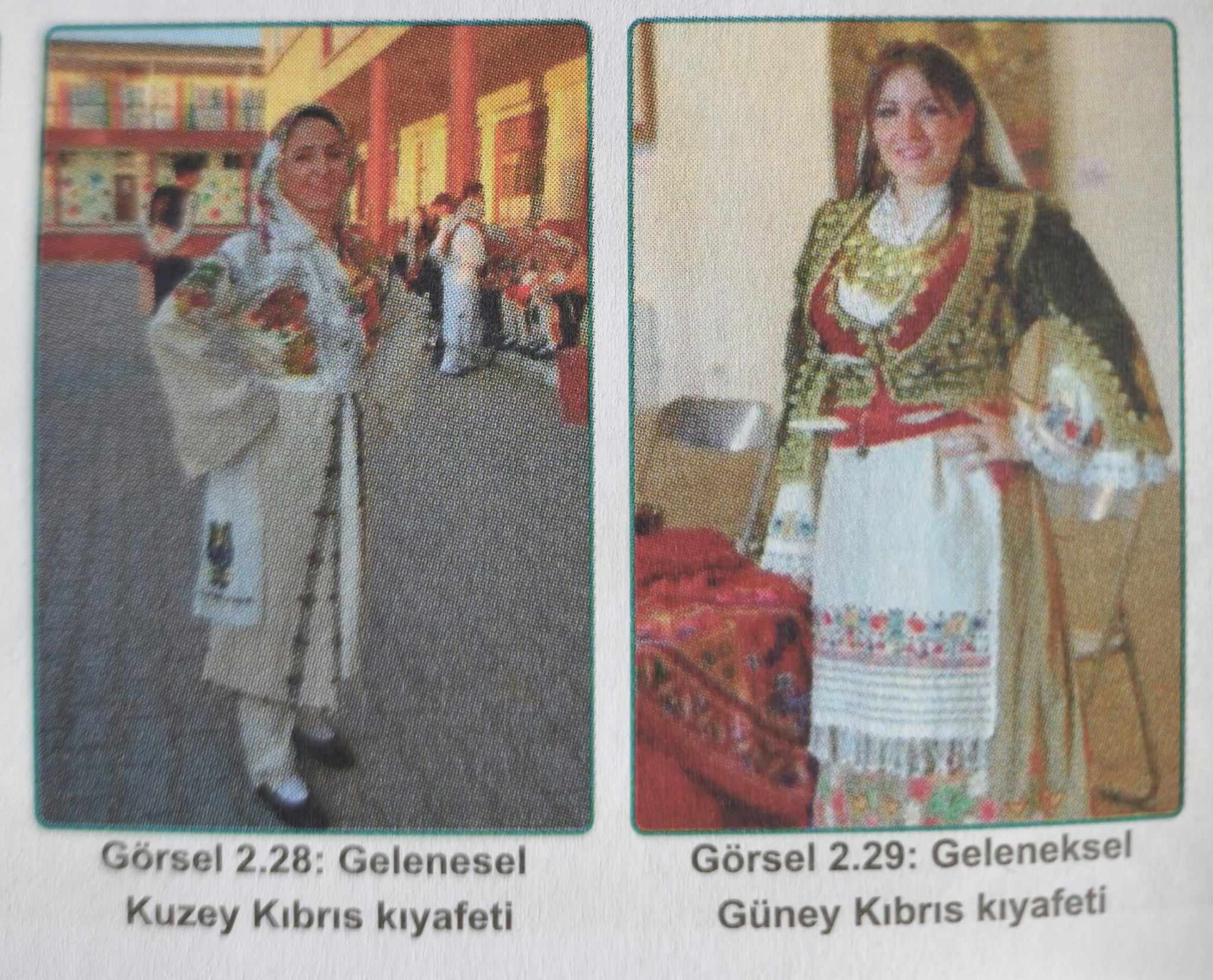 “5. sınıf Sosyal Bilgiler kitabı. Sayfa 46… Görsel 2.28’in altında “Geleneksel” sözcüğü “Gelenesel” olarak yazılmış! Keşke hata bundan ibaret olsa! “Geleneksel Kuzey Kıbrıs kıyafeti” ile “Geleneksel Güney Kıbrıs kıyafeti” diye bir ayrım var. Dikkatinizi çekerim! O da yanlış olurdu ama “Kıbrıslı Türk” ve “Kıbrıslı Rum” kıyafeti ayrımı da değil! Bu kıyafetler 1974’ten sonra kullanılmaya başlanmadı herhalde! 1974’ten önce kıyafetlerde kuzey-Güney Kıbrıs diye bir ayrım mı var? Yani şu anda güneyde olan Baf’taki Kıbrıslı Türkler “görsel 2.29″daki kıyafeti, şu anda kuzeyde olan Girne’deki Kıbrıslı Türkler “görsel 2.28″deki kıyafeti mi giyiyordu? Bu kitapları güncelleyenlerin Kıbrıs tarihi ile ilgili bilgileri bundan mı ibaret? Kıbrıs’taki geleneksel kıyafetlerle ilgili tuğla gibi kitaplar yazdı insanlarımız. Hadi kuzeyi-güneyi bilmiyorsunuz, bu kitaplara bir bakmak da mı yok?