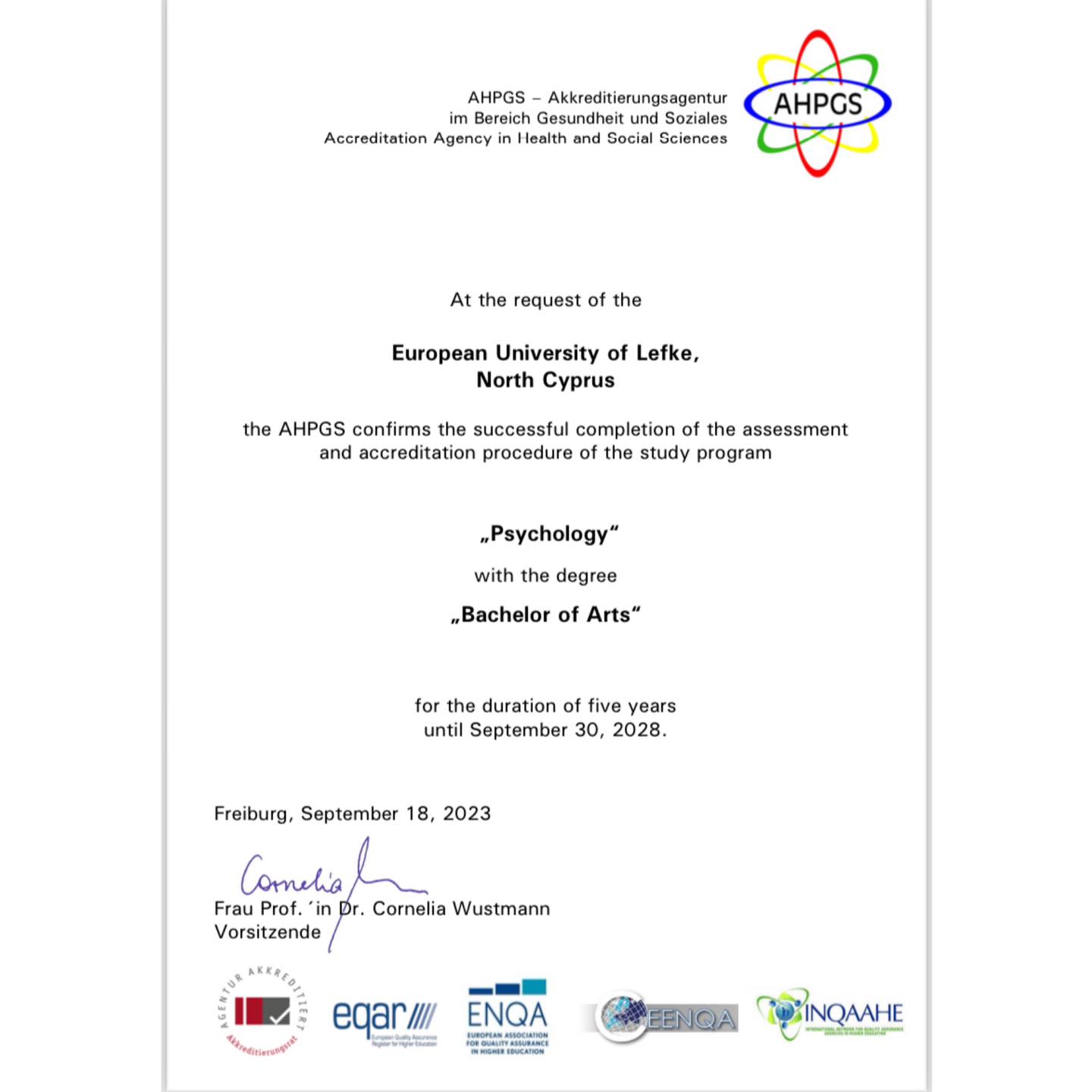 Eğitim kalitesinin uluslararası bağımsız akreditasyon kuruluşları tarafından belgelenmesi olan akreditasyonlar noktasında başarılar elde etmeye devam eden LAÜ’nün Fen Edebiyat Fakültesi Psikoloji Programı, AHPGS (Accreditation Agency in Helath and Social Sciences) tarafından 30 Eylül 2028 yılına kadar akredite edildi.