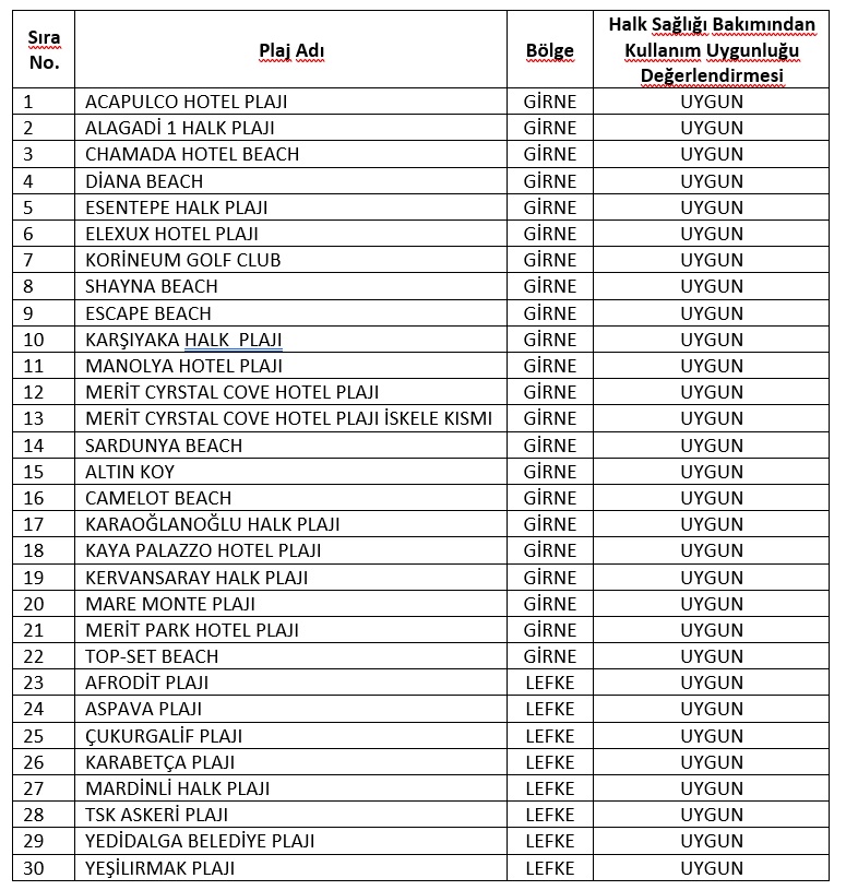 Bu doğrultuda, 2 Temmuz 2024 Tarihinde Girne Bölgesi plajlarımızdan ve 3 Temmuz 2024 Tarihinde Güzelyurt-Lefke Bölgesi plajlarımızdan alınan deniz suyu numunelerinin analizleri sonuçlanmış olup, numunelerin alındığı plajlarımız ve analiz sonuçlarına ait değerlendirmeler aşağıda listelenerek kamuoyu ile paylaşılmıştır.