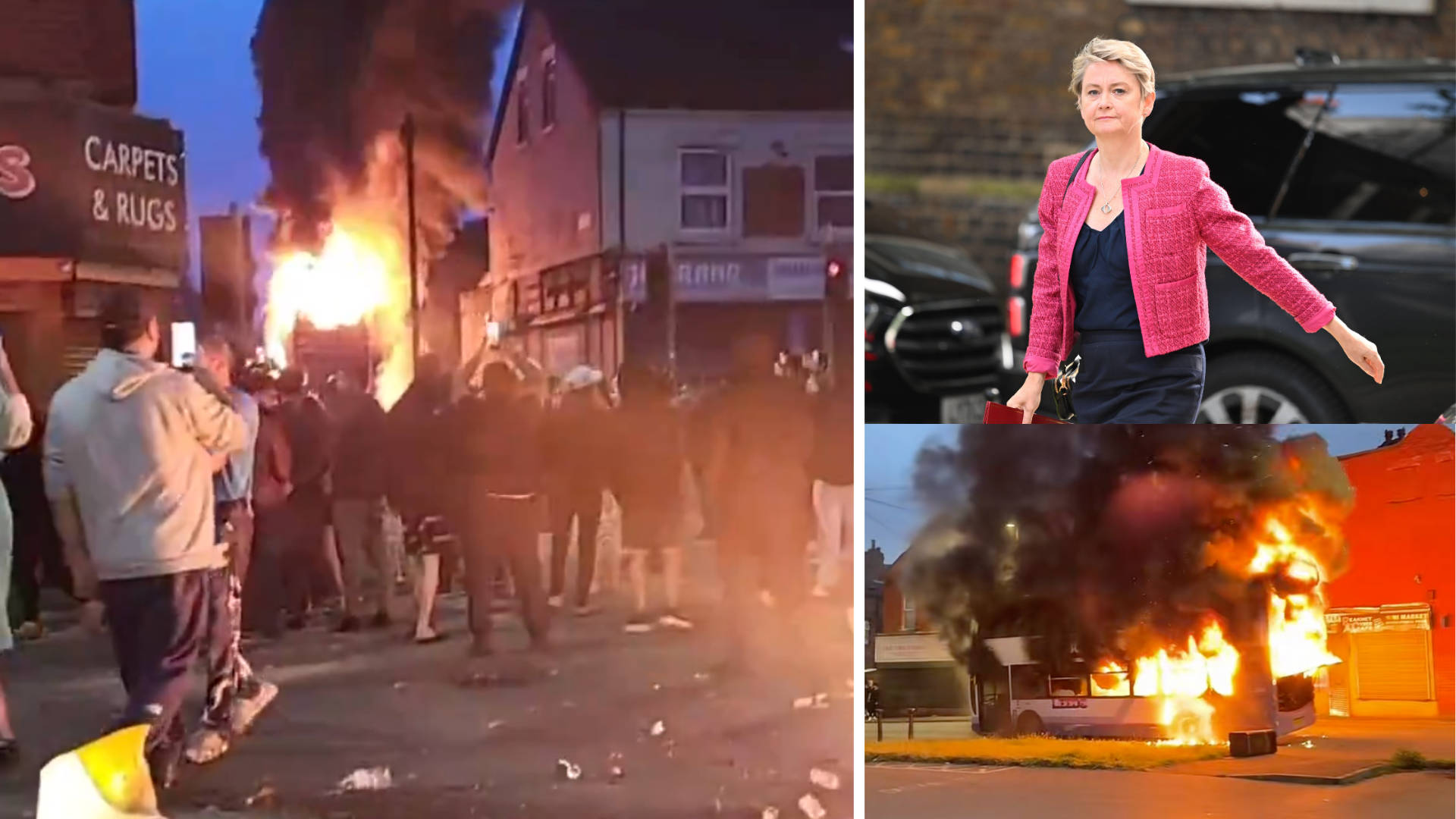 Sosyal medyada paylaşılan görüntülerde kalabalığın bir polis aracının camlarını çocuk arabası, taş ve bisikletlerle kırdıktan sonra aracı devirdiği görüldü. Ayrıca, görüntülerde göstericilerin çift katlı bir toplu taşıma aracını ateşe verdiği kaydedildi.