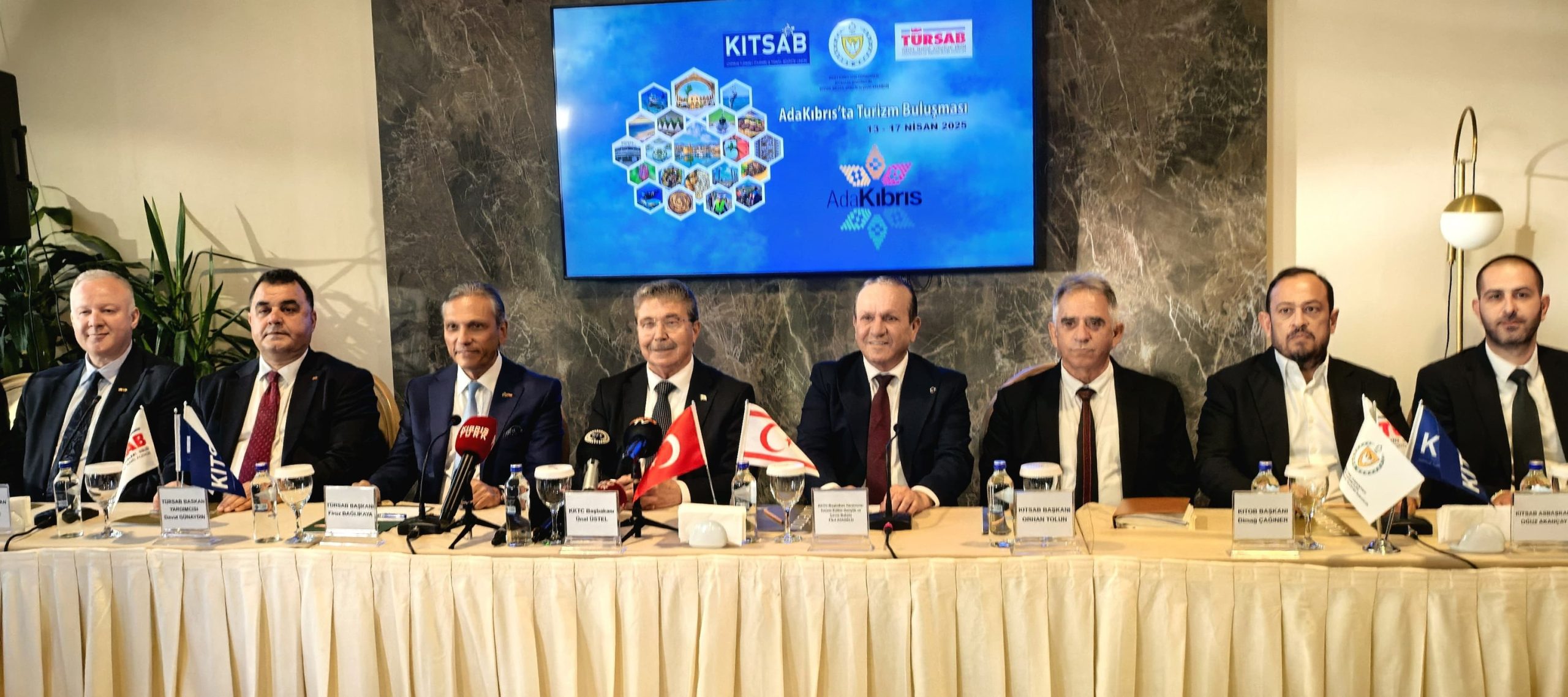 Girne’de Acapulco Otel’de gerçekleştirilen ortak basın toplantısına; Başbakan Ünal Üstel, Başbakan Yardımcısı, Turizm, Kültür, Gençlik ve Çevre Bakanı Fikri Ataoğlu, Türkiye Seyahat Acenteleri (TÜRSAB) Başkanı Firuz Bağlıkaya ve yardımcıları, Kıbrıs Türk Otelciler Birliği (KITOB) Başkanı Dimağ Çağıner, Kıbrıs Türk Turizm ve Seyahat Acenteleri Birliği (KITSAB) Başkanı Orhan Tolun, Kıbrıs Türk Turizm ve Seyahat Acenteleri Birliği (KITSAB) As Başkanı Oğuz Akançay ile turizm acenteleri temsilcileri katıldı.